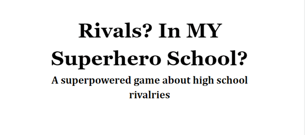 “Rivals? In MY Superhero School?” (RIMSS) is a four-page superhero hack of the infinitely hackable space opera RPG “Lasers and Feelings” (LaF), though it differentiates itself from its parent game by more than just setting. Where LaF is designed for a group of players and a GM, RIMSS is a GM-less game designed for two players. The GM is replaced by a randomly determined premise explaining why the player characters are rivals as well as a list of twelve scenes, six of which will see action in a given game.