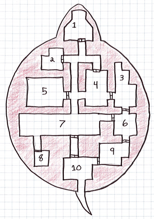 Players could also try to enter the “southern hatch” at the base of the turtle’s tail which is roughly fifteen feet above the ground. This garbage chute leads to the filth pit (Area 10) which is largely unguarded, though not unoccupied. A hungry ooze dwells here, feasting on the organic refuse that passes through. Players taking any damage while in or near the garbage chute must save vs. poison or contract filth fever.